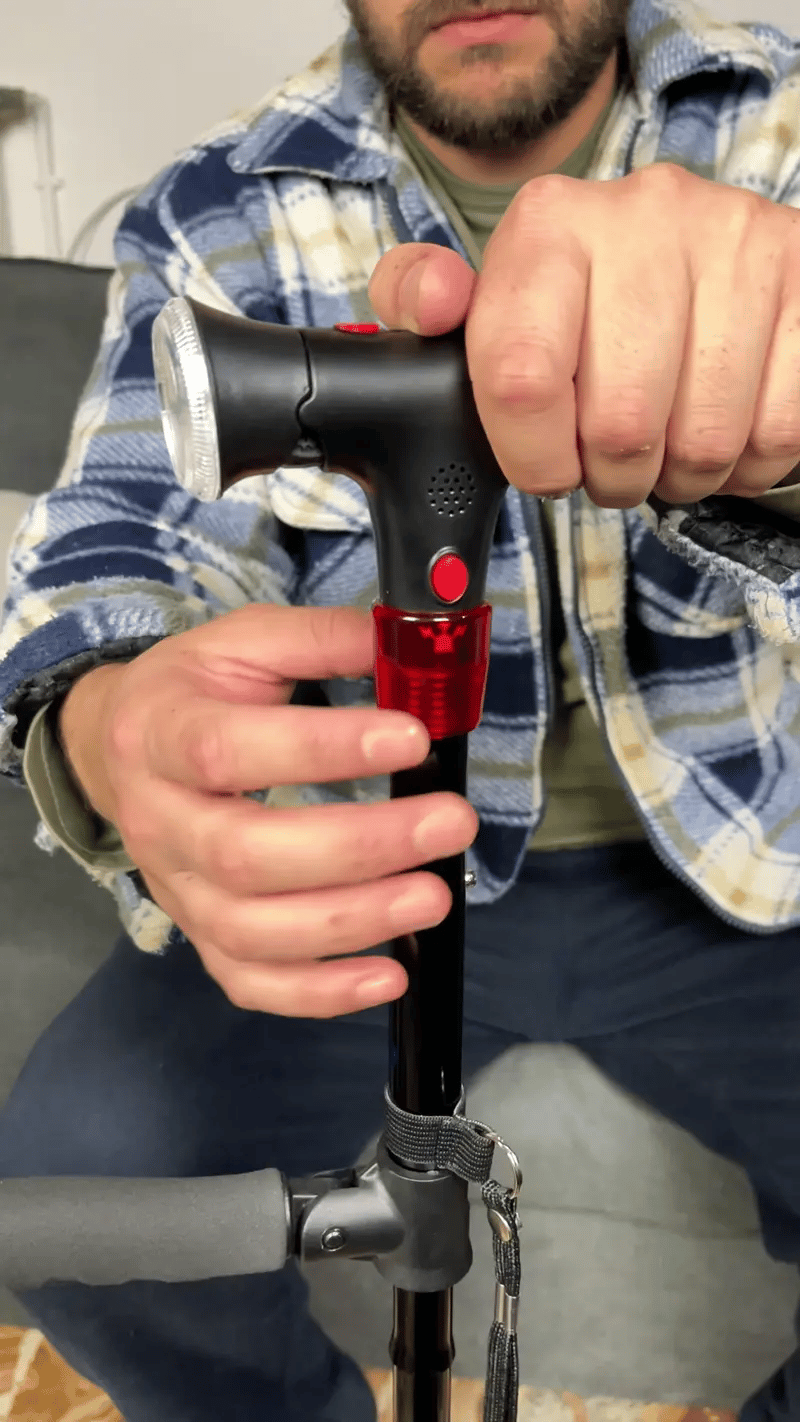 The Twin Grip Cane features a second handle, making it easier to stand up from a seated position without needing extra help. It also has an ultra-bright LED for visibility and an emergency alert button for added safety.